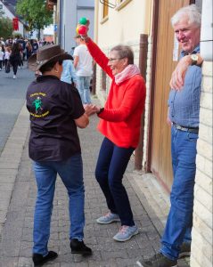 Nachdem Michael die anwesenden Tänzer und Gäste begrüßt hatte, sorgte die „Purling Brooks Band“ in bewährter Art und Weise dafür, dass bis spät in die Nacht eifrig getanzt wurde. Dabei konnte man die Selzer Line Dancer gut an den froschgrünen Jubiläums-Shirts auf der Tanzfläche erkennen …